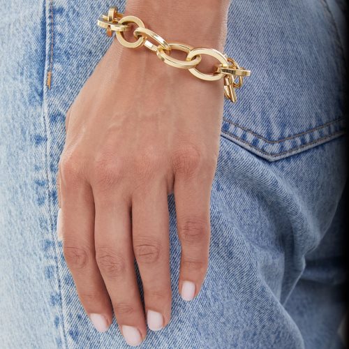 Bracciale catena a maglie ovali con bordo squadrato, in bronzo placcato oro giallo 24kt. Chiusura a T-bar con adjust. Un bracciale classico, di moda oggi e sempre. Lunghezza 21 cm.