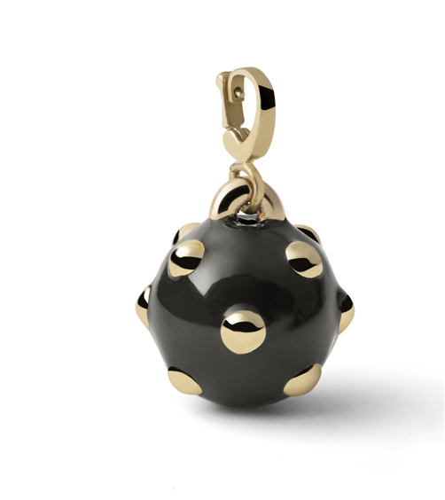 Charm pendente a forma di mina e smalto nero. Unoaerre rivisita un grande classico dell'oreficeria traendo ispirazione direttamente dagli archivi storici anni '50. Tornano così le iconiche Mine, nate nel secondo dopoguerra con l'intento di esorcizzare le paure e le sofferenze passate. Simbolo di rinascita e nuova prosperità, furono indossate anche da Sophia Loren nell'intramontabile film "Ieri, Oggi e Domani".