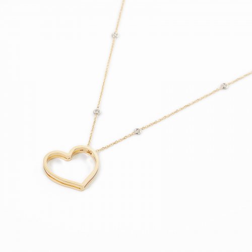 Collana in oro 18kt con cuore medio 20 mm e catena forzatina lunga 43-45 cm con 4 diamanti naturali di taglio brillante ct 0,04. L'iconica forma del cuore, simbolo per eccellenza d'amore, unione e sentimento, viene esaltata dalla luce di oro e diamanti dando vita ad una creazione unica che celebra l'insieme di sentimenti che questa figura da sempre incarna.