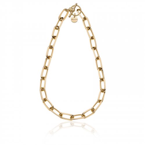 Collana di catena forzatina battuta in bronzo lucido con bagno in oro 24 kt. Chiusura a T-bar e medaglietta con logo Unoaerre. Un amato classico della moda catene in una versione nuova e dal design elegante ed essenziale. Indossala con bracciale ed orecchini coordinati o crea il tuo stile abbinandola ai tuoi charms preferiti. Misura 45,00 cm.