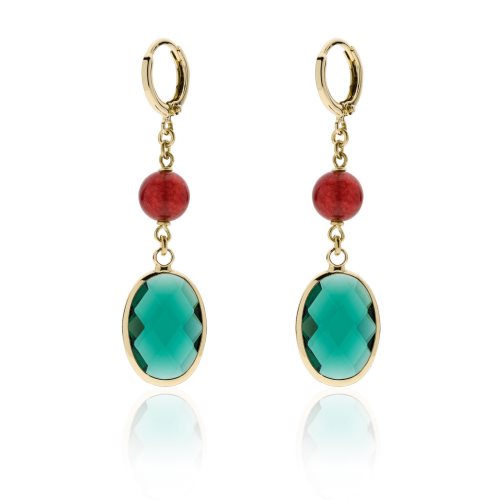 Orecchini pendenti con pietra verde smeraldo e perla rossa. Galvanica in oro, chiusura a monachella. Questi Chandelier eleganti risplendono nei vivaci colori dell'India tra elaborati tessuti dei shari, magici intrecci di tappeti e profumate spezie. Abbinali ai gioielli della collezione Jaipur e scegli il tuo mix dall'allure esotica e vibrante.Materiale: Bronzo Colore: Dorato Pietre: cristallo verde e perla di cristallo rossa Bagno galvanico: oro giallo 24 kt Finitura: lucida Chiusura: monachella tonda Lunghezza: 5,50 cm