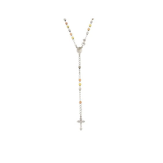 Collana rosario in argento tricolore 925% ideato e realizzato da Urania Preziosi, la collana ha una lunghezza di 50 centimetri e un pendente di 11 centimetri, chiusura a moschettone.