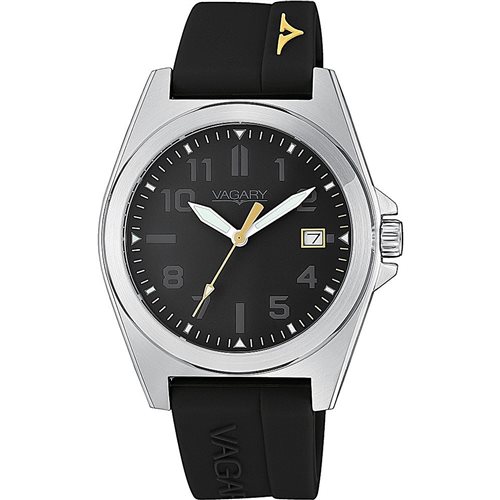Orologio Solo Tempo Da Bambino Di Vagary Della Collezione Boy. Modello Con Cassa In Acciaio. Il Diametro Della Cassa È 36 Mm. Orologio Con Quadrante Nero Con Numeri Arabi, Cinturino In Morbido Poliuretano Nero E Vetro Minerale. Modello Con Resistenza All'Acqua Di 5 Atm, Movimento Al Quarzo Citizen E Datario.