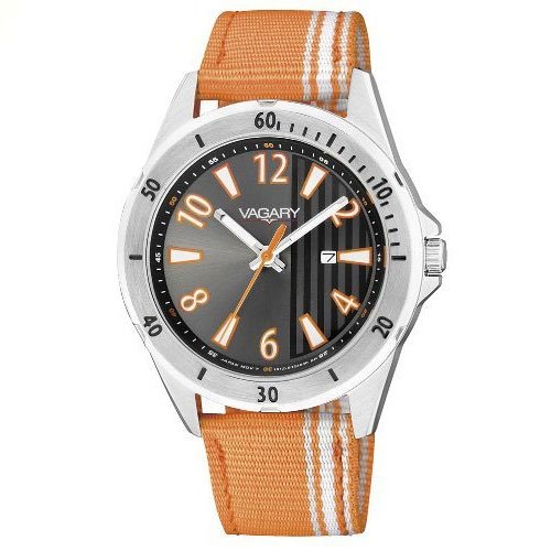 Orologio Vagary Boy da bambino con quadrante nero, cassa acciaio 5 atm, cinturino in tessuto arancione con strisce bianche