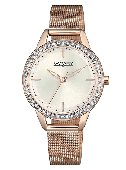 Al quarzo Citizen, cal. G1036. CARATTERISTICHE Cassa in acciaio con 48 cristalli sulla lunetta. Bracciale acciaio in fine maglia Milano. Vetro minerale sferico. WR 5 bar.
