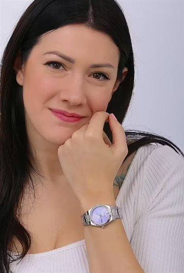 Orologio solo tempo da donna di Vagary della collezione timeless. Con cassa in acciaio diametro cassa 32mm. Orologio con quadrante lilla lavorato guilloscé con indici e lancette di color acciaio. Ha un bracciale in acciaio con chiusura a pulsante. La resistenza all'acqua è di 5 ATM. Il movimento è al quarzo citizen. Il quadrante è di vetro minerale.