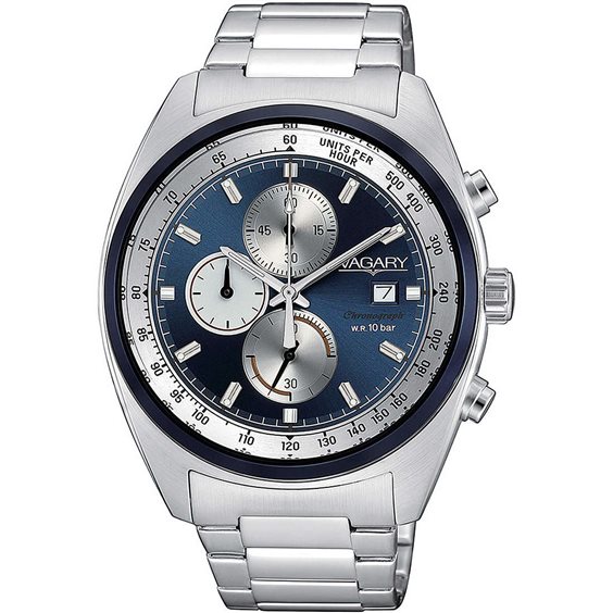 Vagary Rockwell VA1-315-71 – Orologio cronografo da uomo in acciaio con quadrante blu e corona a vite Un cronografo elegante e sportivo che coniuga precisione e fascino: il Vagary Rockwell VA1-315-71 presenta una cassa in acciaio satinato da 42 mm e un quadrante blu con tre contatori cronografici, datario, indici e lancette luminescenti e scala tachimetrica sulla lunetta. Il movimento al quarzo Citizen cal. 0510 garantisce affidabilità, mentre il vetro minerale protegge il quadrante. Il bracciale in acciaio con chiusura deployante a pulsante assicura comfort e praticità. Con corona e fondello a vite e una resistenza all’acqua fino a 10 ATM, è perfetto per l’uso quotidiano e il tempo libero. Diametro cassa: 42 mm Movimento: Quarzo Citizen cal. 0510 Vetro: Minerale Materiale cinturino: Acciaio Tipo di chiusura: Deployante con pulsante Funzioni: Cronografo, datario, scala tachimetrica Corona: A vite Fondello: A vite Resistenza all’acqua: 10 ATM (100 metri) Genere: Uomo Brand: Vagary by Citizen Stile/ispirazione: Sportivo casual Un orologio che unisce stile e funzionalità, pensato per chi ama l’equilibrio tra design deciso e performance.