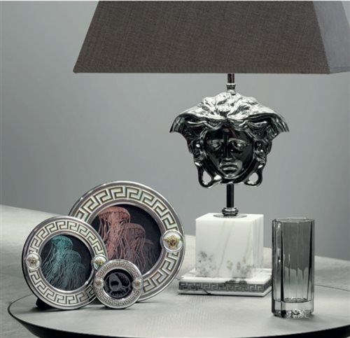 Cornice tonda d.18 adornata con i motivi iconici di Versace, come la chiave greca e la testa di Medusa che introduce i metalli colorati. Made in Italy by Rosenthal.