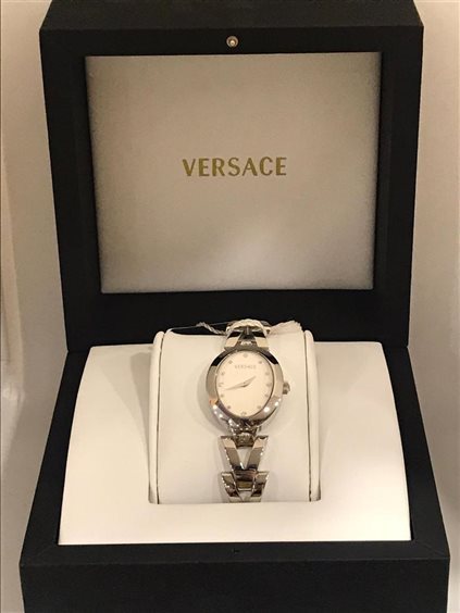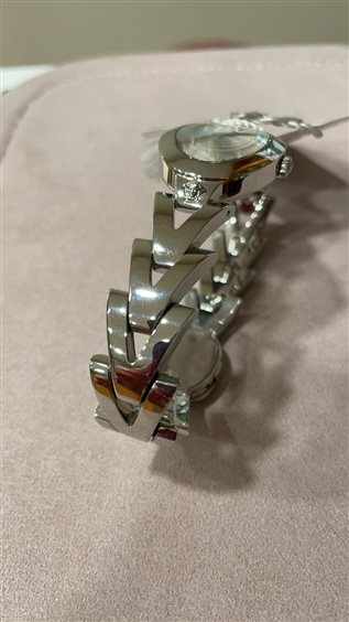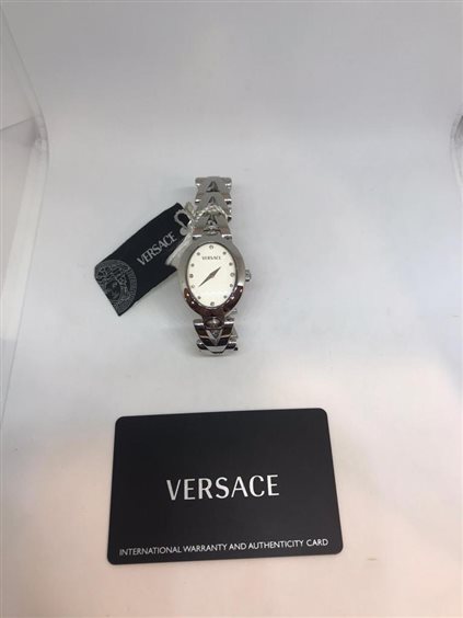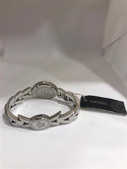 Orologio Versace V-GLAM donna cassa e cinturino in acciaio dalla linea raffinata ed elegante con chiusura bracciale gioiello, quadrante ovale fondo argento con greca che contraddistingue il prestigioso marchio, solo tempo.Resistenza all'acqua 3 ATM.