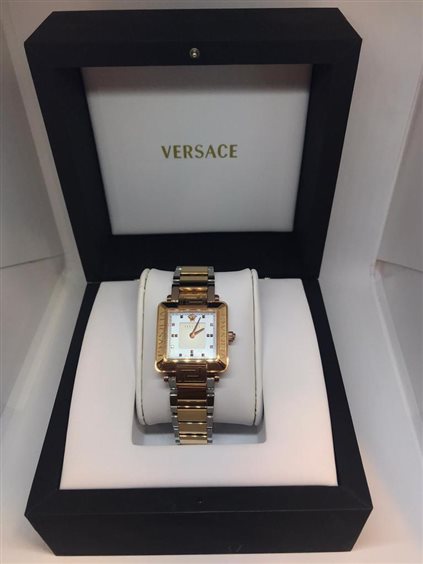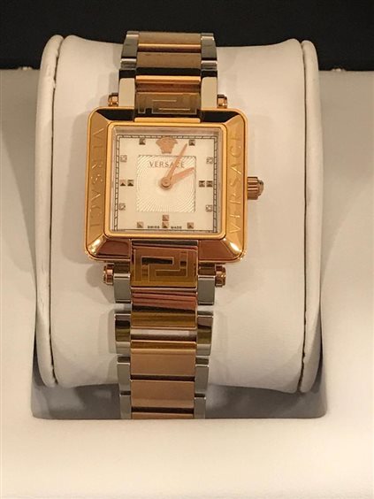 Orologio Versace donna modello Reve Carre Solo Tempo, cassa e cinturino in acciaio bicolore acciaio bianco e placcato oro rosa, chiusura doppia deployante. Quadrante quadrato fondo madreperla e diamanti taglio brillante.