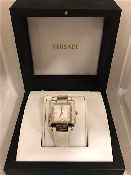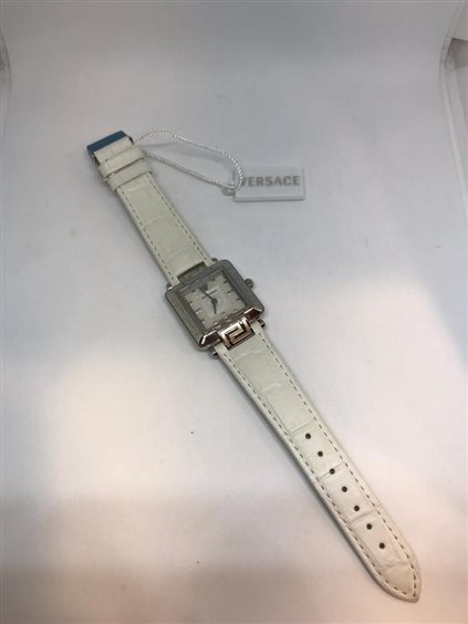 Orologio Versace donna modello Rave Carrè cassa in acciaio quadrante quadrato con fondo madreperla solo tempo senza numeri con cinturino pelle bianco con chiusura deployante in acciaio. Movimento svizzero al quarzo. Resistenza all'acqua 3 ATM.