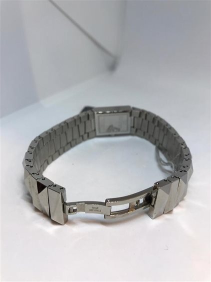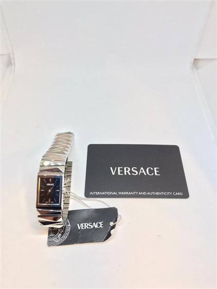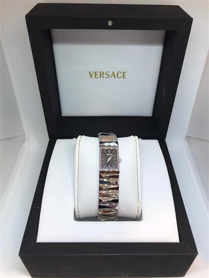 Orologio Versace donna cassa e cinturino in acciaio con quadrante rettangolare 16 mm x 24 mm solo tempo fondo nero, chiusura doppia deployante, movimento svizzero a quarzo. L'orologio presenta qualche piccolo graffio sul fondello dovuto al cambio batteria.