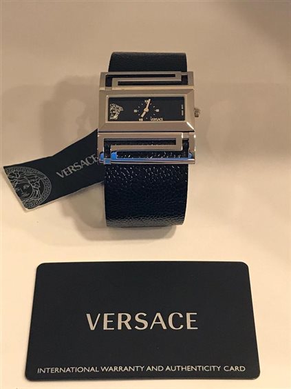 Orologio Versace Deauville Cassa in acciaio e quadrante rettangolare fondo nero con simbolo Versace Medusa sul fondo, solo tempo con movimento a quarzo svizzero. Resistente all'acqua 3 ATM. Cinturino pelle vera di struzzo nera con chiusura deployante in acciaio.