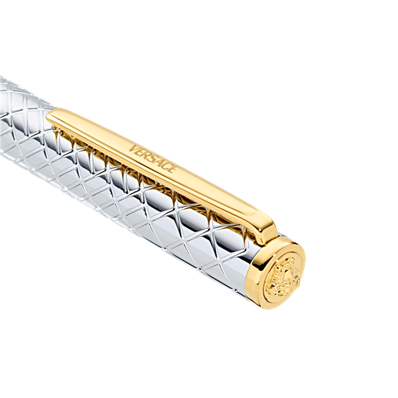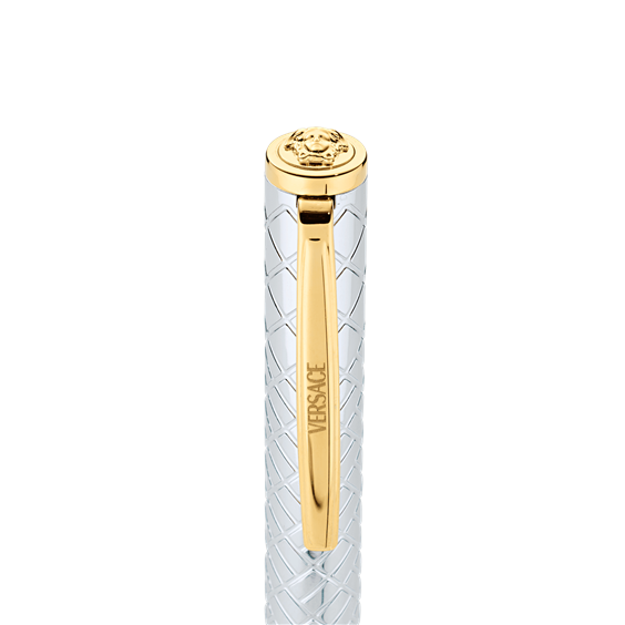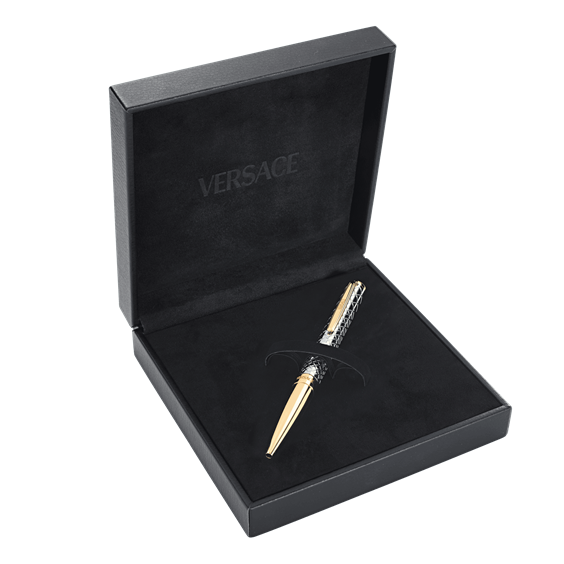 La penna roller in acciaio inossidabile presenta un pattern geometrico all-over sul fusto con l'iconica Medusa sulla parte superiore. L'elegante design è impreziosito da un Versace Logo inciso al laser sulla clip. Accessorio Medusa Incisione Versace Logo Fusto: acciaio inossidabile e placcatura ionica in oro giallo Custodia protettiva con Versace Logo Swiss Made Vestibilità e misura Lunghezza: 136 mm / Ø 13 mm Peso approssimativo: 42 g
