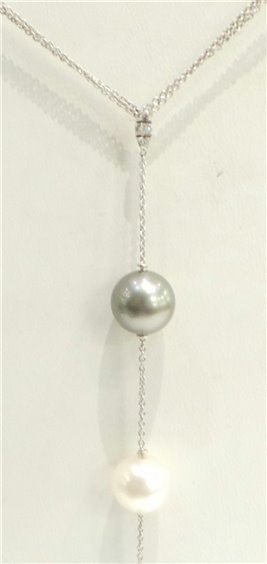 Collier in oro bianco 18kt, gr. 4,10 con catena rolò, lunghezza totale cm 41, impreziosito da perle naturali di acqua salata bianche e grigie, dimensioni mm 9, con pendente centrale cm 10, con perla finale a goccia grigia e piccolo ovale in oro bianco con brillantini. Chiusura a moschettone. Marca Yukiko