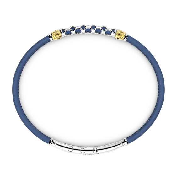 Bracciale Zancan in pelle naturale blu con targa in argento 925 parzialmente dorata con oro giallo. La chiusura è in acciaio inox regolabile