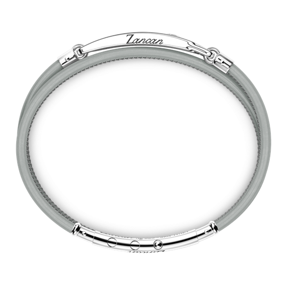 Bracciale Zancan in pelle naturale grigia a doppio giro con targa in argento 925 e spinelli neri. La chiusura è in acciaio inox regolabile