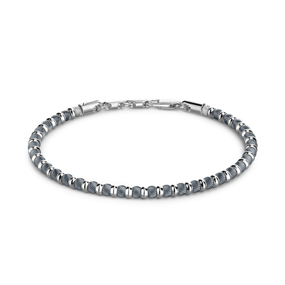 Il bracciale alterna sfere lucide ad altre zigrinate di tonalità nera; la maglia morbida permette al bracciale di adattarsi perfettamente al polso. Un gioiello dal design ricercato, adatto per qualsiasi occasione. La chiusura a moschettone consente la regolazione da cm.19 a cm.21.