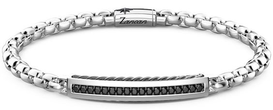 Bracciale in argento con maglia tipo cardano. La targa centrale ha una lavorazione tipo corda brunita laterale, mentre nella parte superiore sono incastonati degli spinelli neri.
