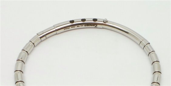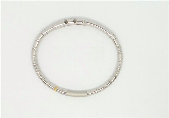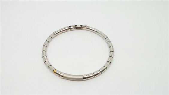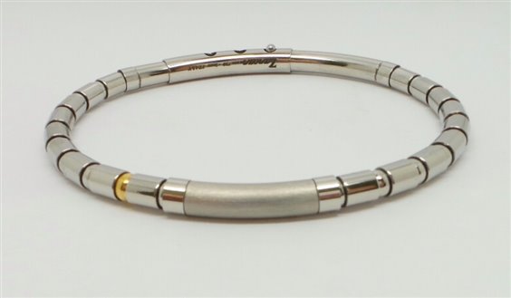 bracciale in acciaio semirigido di diametro 5 mm con segmenti circolari e piastrina centrale, lateralmente riporta sferetta in oro giallo . Il bracciale si apre e si puo' regolare la misura posizionandolo in fori predisposti riporta internamente logo e punzone secondo normative . DIAMETRO DEL POSO MASSIMO CM 7