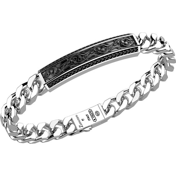 Bracciale a grumetta in argento con placca centrale con motivo gotico in rodiatura brunita, spinelli neri laterali. LARGHEZZA LAVORAZIONE CM 1,9. Chiusura a pressione con sicura a scatto. Bracciale pesante e intenso nei motivi, in stile gotik che rispecchia la tua anima tenebrosa e ammaliante.