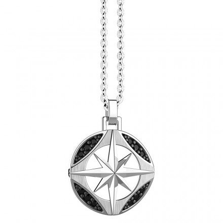 Collana in argento con pendente rotondo. Sul pendente spicca la rosa dei venti accompagnata da 12 spinelli neri. Chiusura a moschettone.