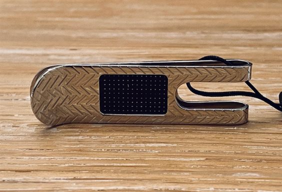 Fermasoldi marca "Zancan" in acciaio inciso con placca centrale in fibra di carbonio. Possibilità di personalizzazione con una incisione a piacere nella parte liscia sotto.