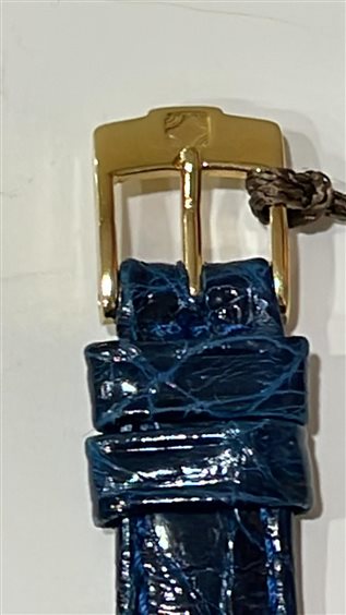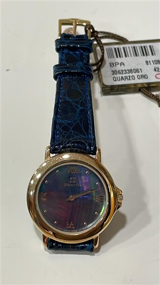 OROLOGIO ZENITH DONNA CASSA IN ORO GIALLO KT 18 CON FONDO IN MADREPERLA, PRESENTI NUMERI ROMANI SUL QUADRANTE, CINTURINO PELLE DI COCCODRILLO BLU CHIUSURA ARDIGLIONE IN ACCIAIO PLACCATO ORO GIALLO.