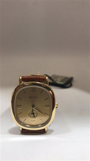 OROLOGIO ZENITH DONNA CASSA IN ACCIAIO DORATO QUADRANTE QUADRANGOLARE FONDO DORATO SOLO TEMPO CINTURINO PELLE CHIUSURA ARDIGLIONE IN ACCIAIO DORATO.