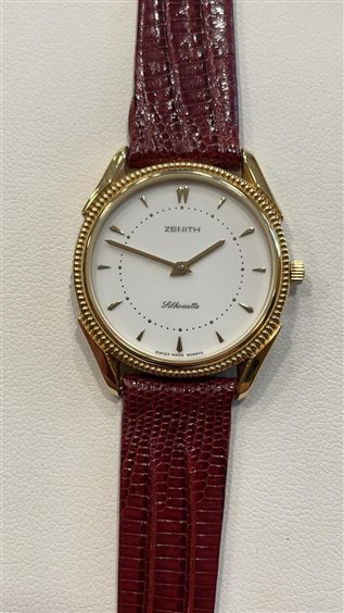 OROLOGIO ZENITH DONNA CASSA IN ACCIAIO PLACCATO ORO GIALLO FONDO BIANCO SOLO TEMPO CINTURINO PELLE COCCODRILLO BORDEAUX CHIUSURA ARDIGLIONE IN ACCIAIO PLACCATO ORO GIALLO.