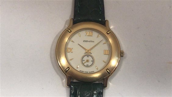 OROLOGIO ZENITH DONNA CASSA IN ACCIAIO DORATO QUADRANTE FONDO BIANCO SOLO TEMPO CINTURINO PELLE CON CHIUSURA ARDIGLIONE IN ACCIAIO DORATO.