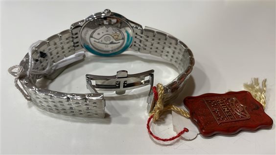 Orologio automatico nuovo di negozio in acciaio "ZENITH ELITE"con scatola e documenti originali. Cassa e cinturino in acciaio con chiusura deployante. Quadrante fondo argento solo tempo con secondiera posizionata al numero 9 e datario posizionato al numero3. Movimento automatico con resistenza all'acqua 3 ATM.
