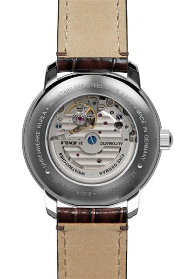 LZ120 Bodensee Automatic. Orologio con movimento automatico giapponese Miyota cal.8315 (con riserva di carica di 60 ore), cassa in acciaio inox, vetro minerale K1, quadrante beige con datario, fondello vitré, cinturino in pelle cucito a mano con fibbia a ardiglione.